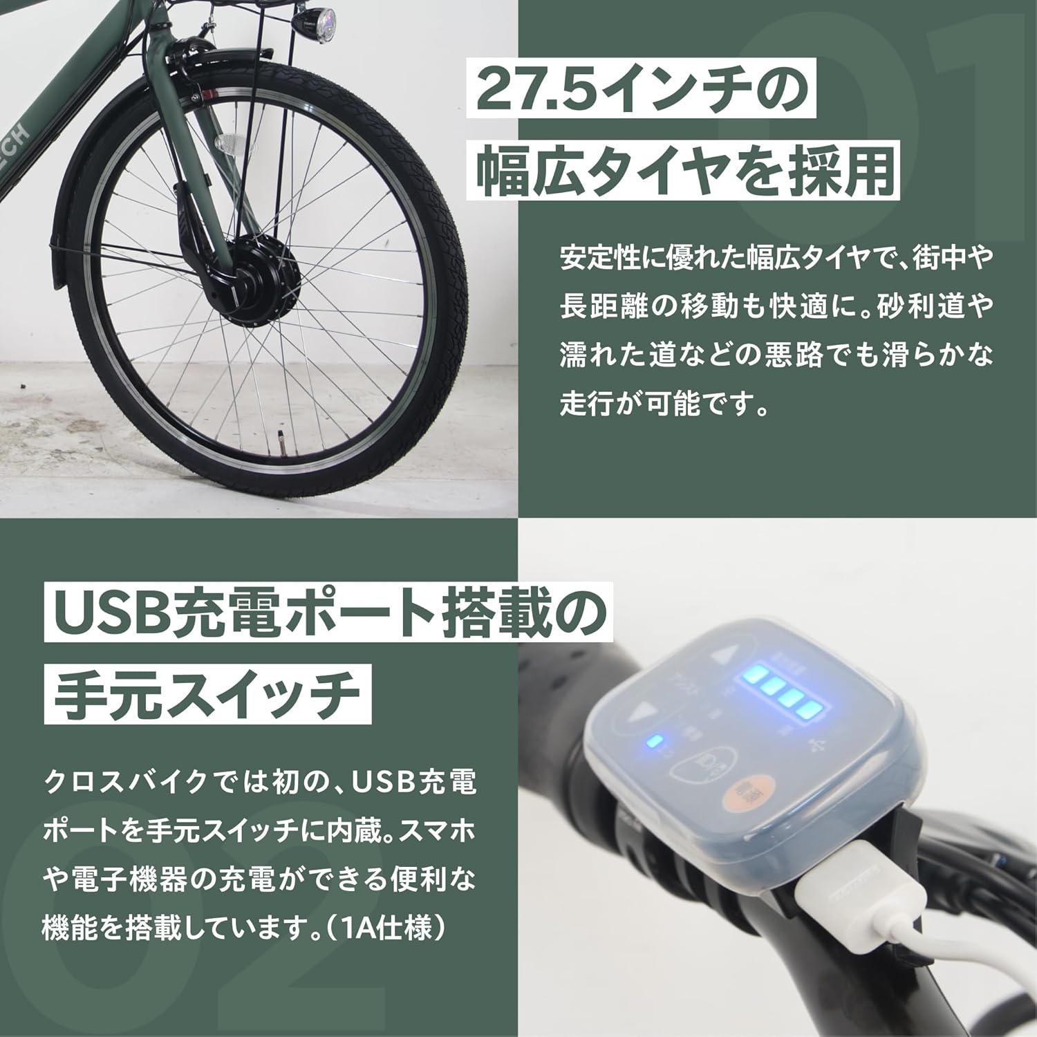 「TDA-207Zplus」は、これまでに販売しておりました「TDA-712LP」や「TDA-207Z」のフィードバックを基に、改良を重ねた新モデルです。 ・前カゴ 後キャリア付きフル装備 電動アシストクロスバイク自転車 ・PELTECH初のUSBポート付き手元スイッチを採用 充電は1Aとなります 1A出力のUSBポート付きで、スマートフォンやライトへの充電が可能 ・27.5インチ1.75サイズの太タイヤ採用し安定した走行 ・シマノ製外装6段変速装備 ・クロスバイクには珍しい両立スタンドで安定した駐輪 ・前カゴ、キャリアを装備しより通勤通学にも便利に