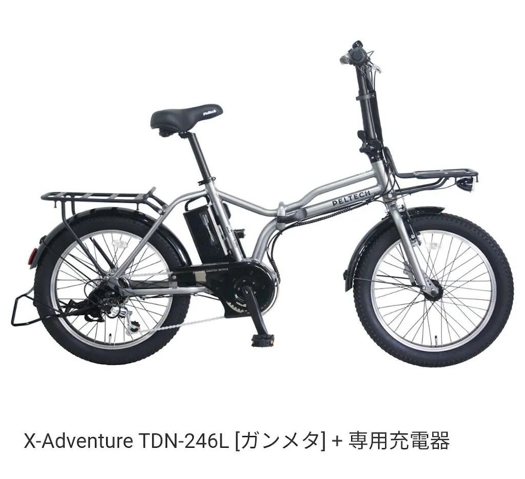 ■ PELTECH X-Adventureの特長 パワフルな走行性能 新開発のセンターモーターシステムを搭載し、力強いアシストを実現。坂道やオフロードでも快適な走行をサポートします。 持ち運びやすい折りたたみ構造 コンパクトに折りたためる設計で、車載や保管がしやすく、アウトドアシーンにも最適。ペダルも折り畳み構造でよりコンパクトに! 安定感のある太めのタイヤ(20×2.6) 悪路でもしっかりグリップし、クッション性が高く乗り心地が良くなって、安全で快適な走行を提供します。 デザイン性と実用性の融合 シンプルかつ洗練されたデザインで、街乗りからアウトドアまで幅広いシーンに対応。両立スタンドを採用しより実用性! 商品詳細 ■モデル名:【X-Adventure】TDN-246L ■全長:1670mm ■全幅:570mm ■重量:約23kg ■サドル高さ:765mm~950mm ■折り畳み時サイズ:L750*W400*H740 ■タイヤ:20x2.6(in) 耐摩耗肉厚チュ-ブ ■変速機:シマノ製外装6段 仕様 ■カラー:マットブラック・マットベージュ・ガンメタ・カーキ・イエロー(数量限定)・グレイ(数量限定) ■ライト:LEDバッテリーライト ■1回の充電で走行可能な距離 (36V8.5Ahモデル・メーカー指定パターン):最大約60km(エコモード時) ■バッテリー容量:36V8.5Ah ( 25.2Vに換算すると12.3Ah相当) リチウムイオンバッテリー/定格出力:250W ■充電器電源:AC100V-240V 充電時間:約5~6時間 <取り扱い注意事項> ・説明書をよく読んで、正しく組み立て、調整してください。 ・安全に使用するため、ヘルメット着用をお勧めします。 ・定期的な点検とメンテナンスを行うことで長く安全にご利用いただけます。 付属品:専用充電器
